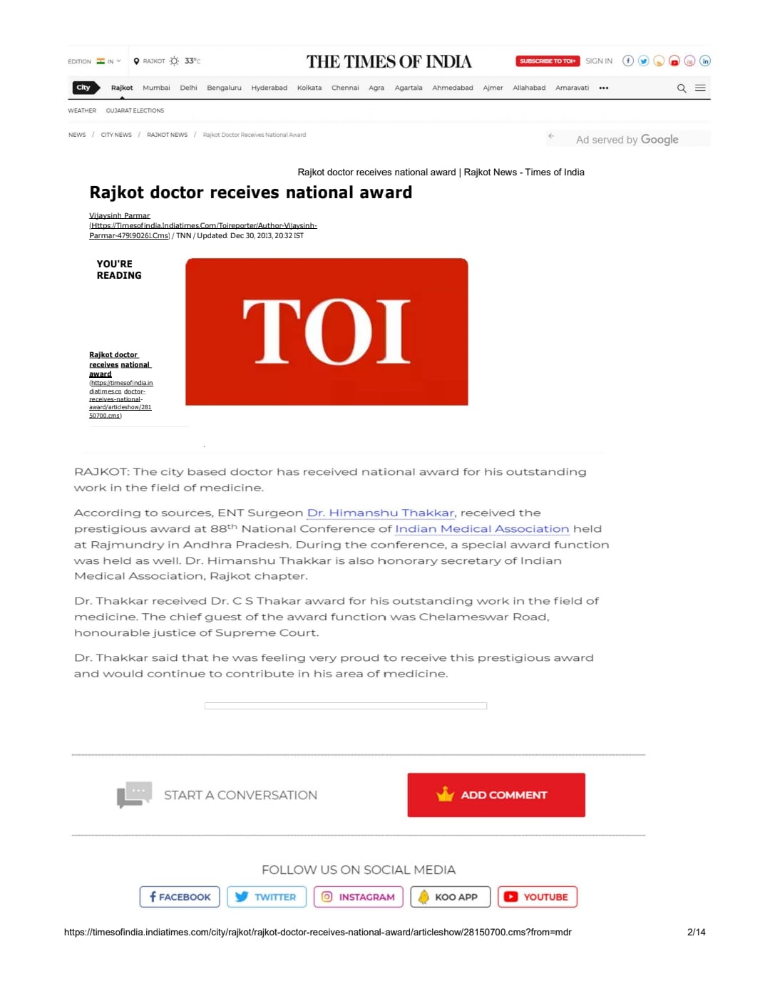 Dr. Thakkar’s dedication to his profession has been recognized with numerous awards, including the IMA Dr. C.S. Thakar National Award,IMA medachievers Award of merit Prest of humanity award, the Pride of Saurashtra Award, and appreciation from Prime Minister Shri Narendra Modi. He is an active participant in medical conferences, a mentor to his peers, and a passionate advocate for public health education, frequently contributing articles and delivering lectures to spread awareness.